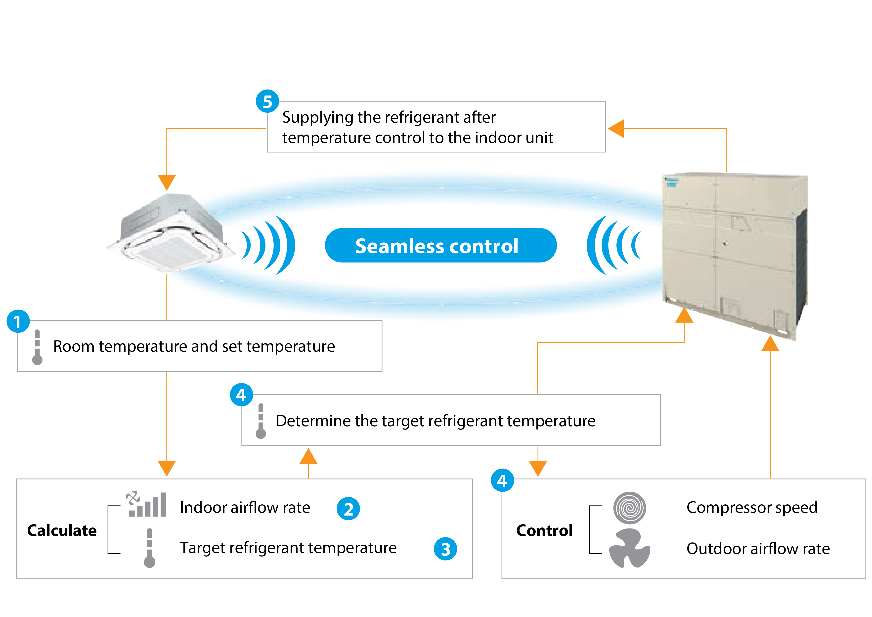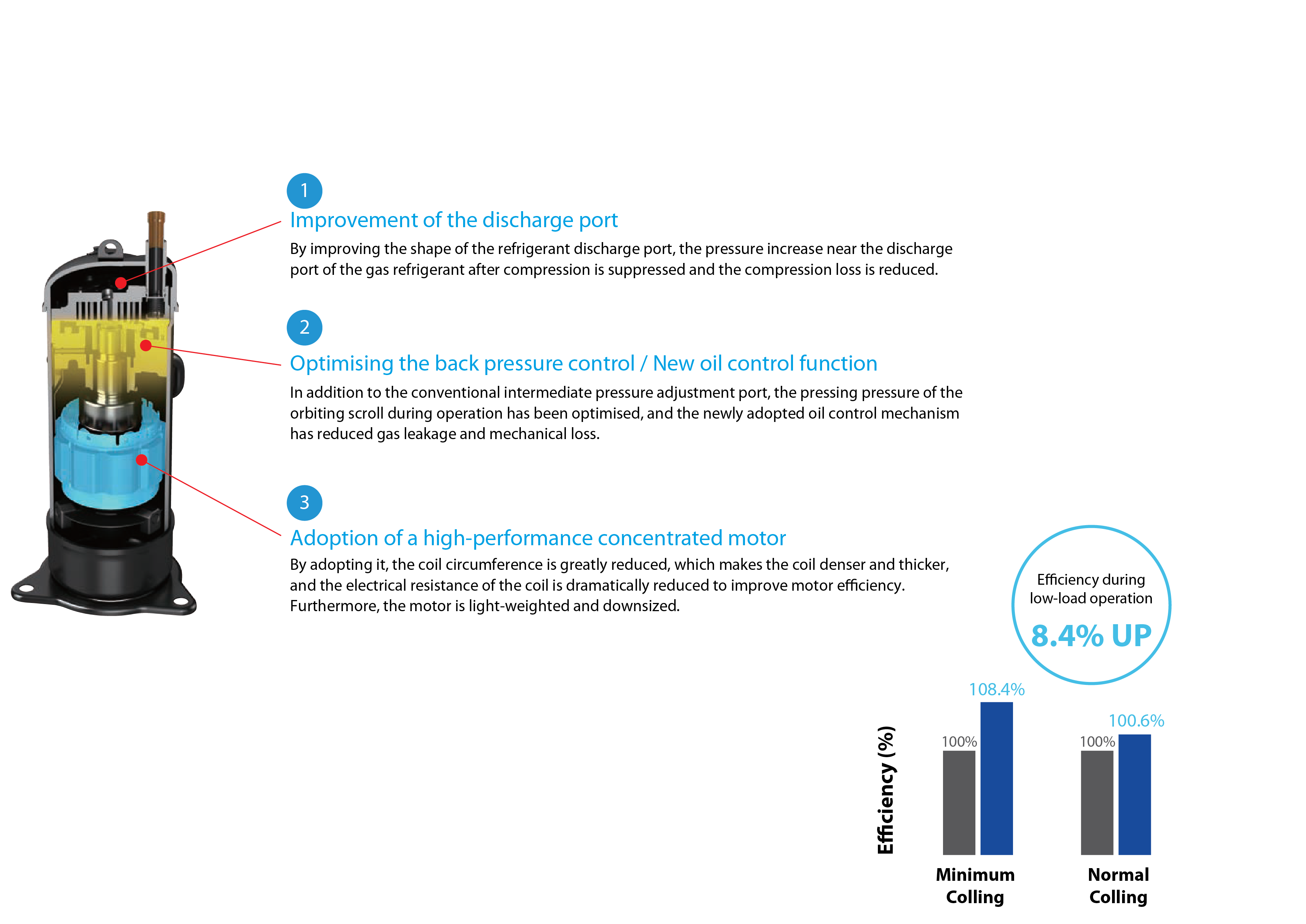 New VRV 6A series improves energy efficiency during actual operation (low load), equipped with a new compressor and VRT Smart II control.