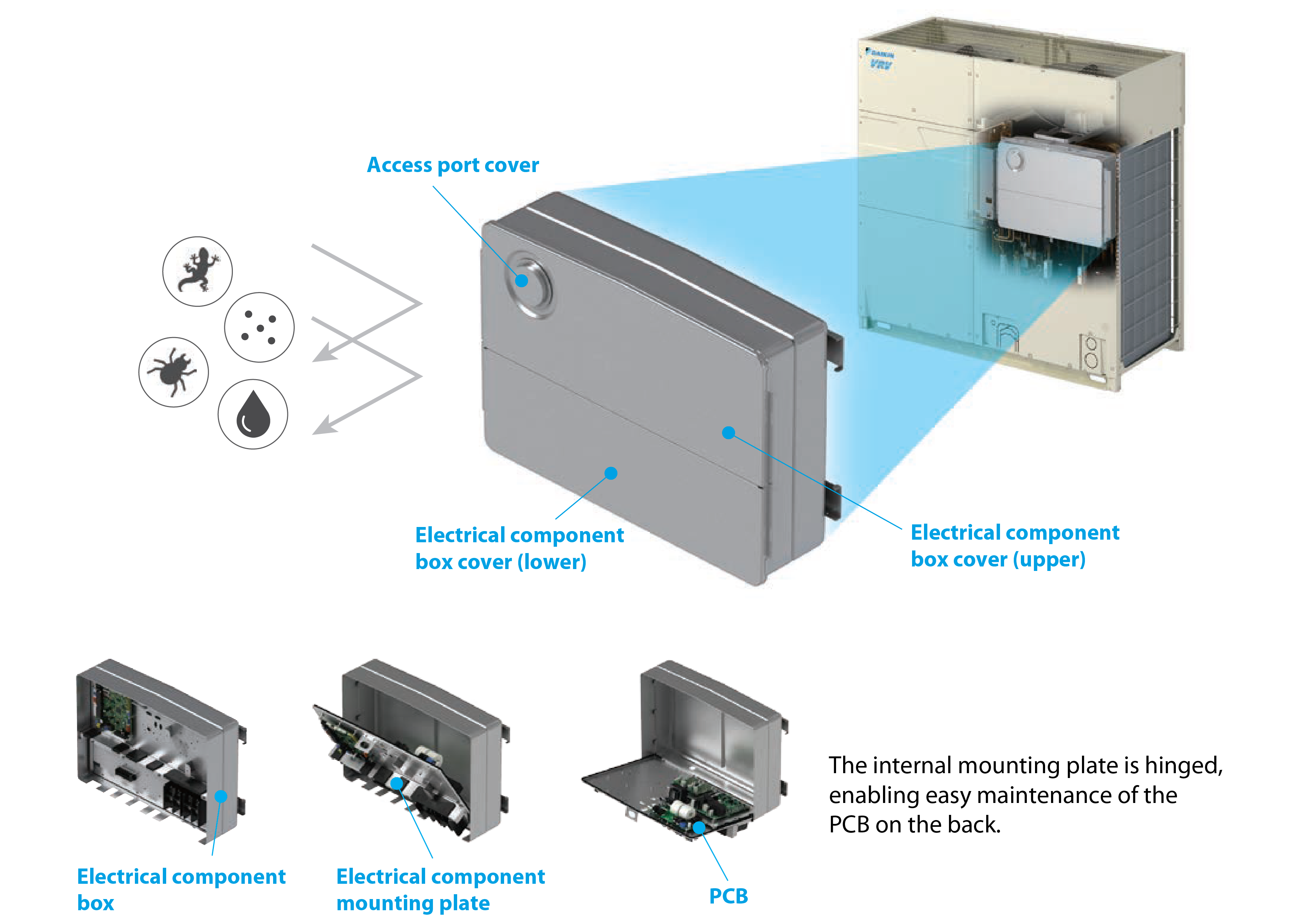 | Sealed electrical component box (IP55) blocks the ingress of debris or water, that leads to unexpected failures. | |