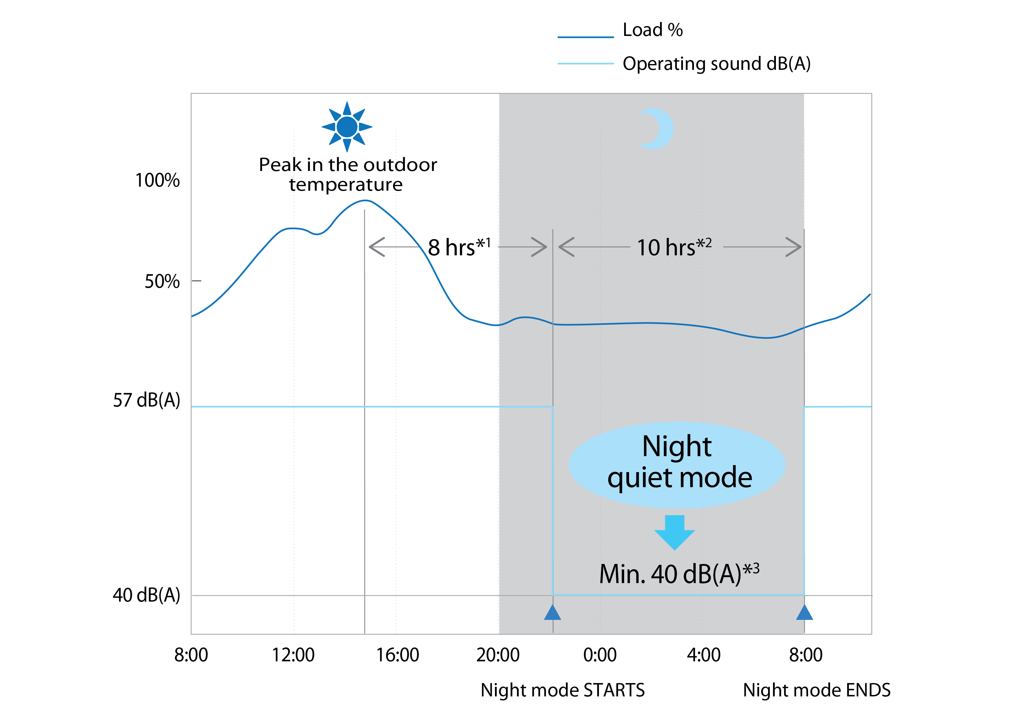 The nighttime quiet operation function automatically suppresses the nighttime operating sound by reducing operation capacity to maintain the quiet environment of the neighborhood. Three selectable modes are available depending on the required level.